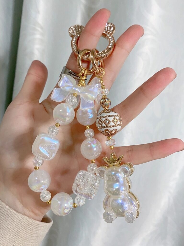 Elegant teddy bear keychain with pearl-finish beads. Cute bow and crown charm for a royal touch.